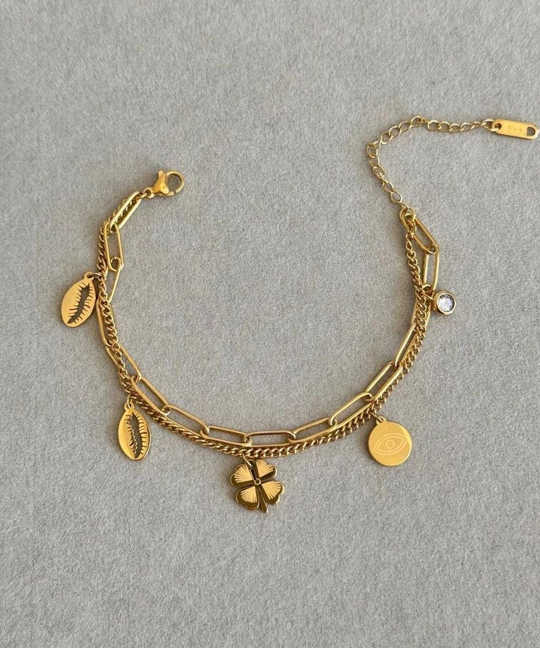 Altın renk zincirden oluşan, yonca ve göz figürlü detaylara sahip minimalist bohem tarzda kadın bileklik.