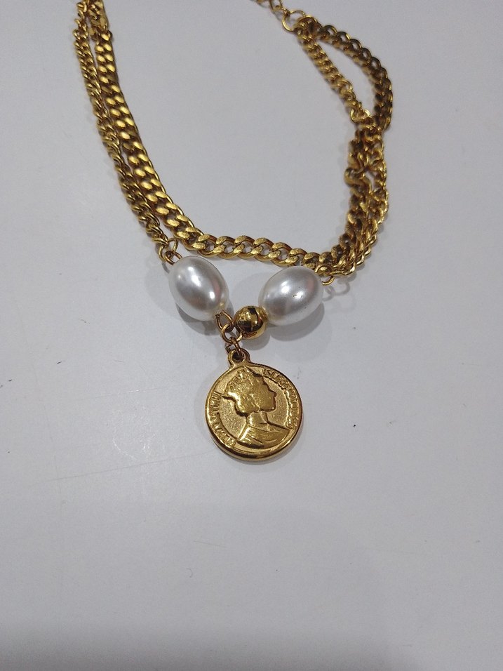 Altın renkli zincir detaylı, iki inci görünümlü boncuk ve vintage madeni para figürlü olan parlak kadın bileklik ✨