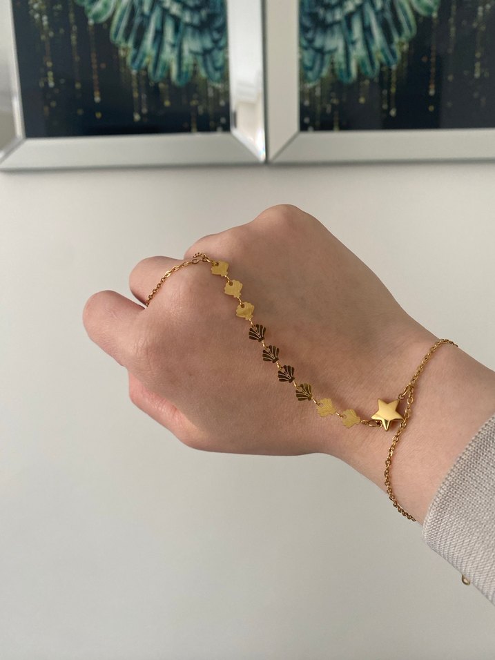Altın renkli, zincir detaylı ve yıldız süslemeli, hafif yılan deseni içeren kadın el zinciri. Günlük kullanıma uygun, bohem tarzda. ✨