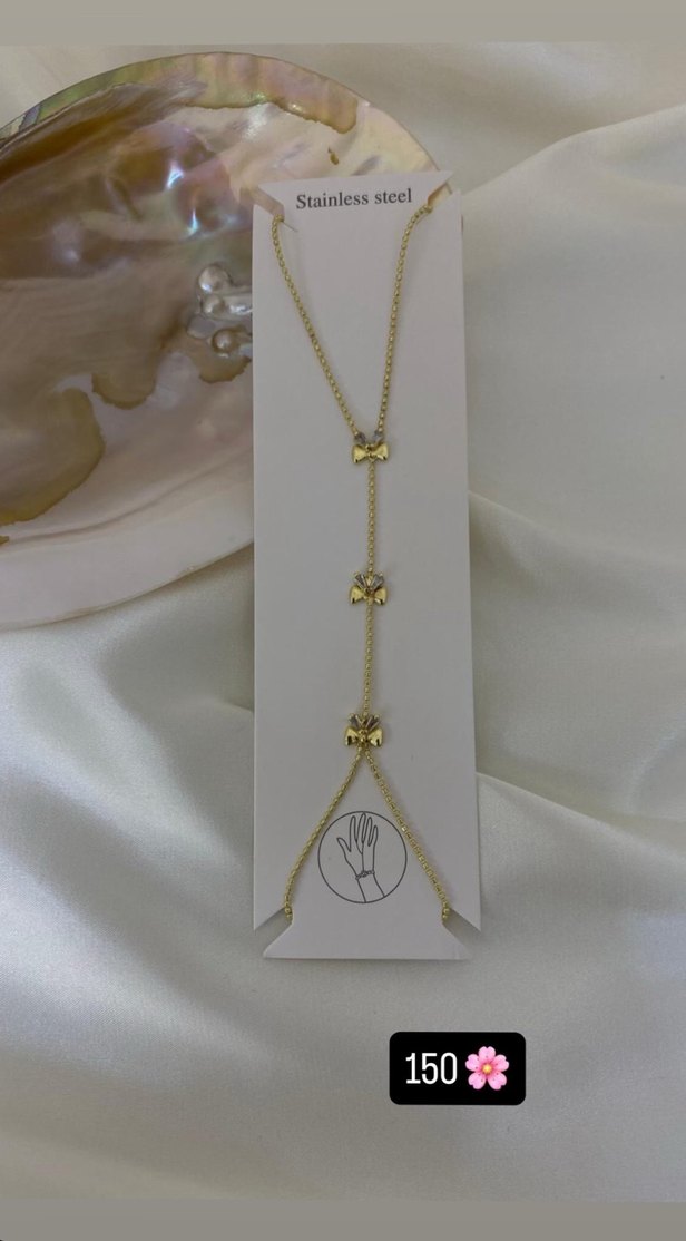 Paslanmaz çelikten yapılmış, altın renkli detaylı fiyonk süslemeli el zinciri. Hafif yılan deseniyle avant-garde tarzda şık bir aksesuar. ✨