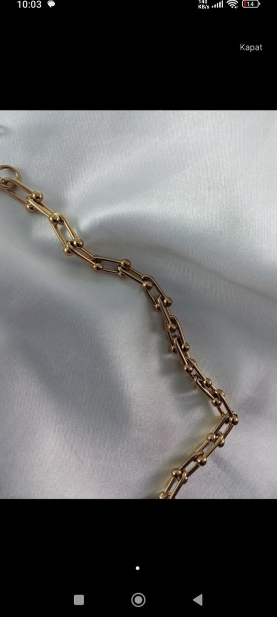 Parlak altın renkli, zincir detaylı minimalist kadın el zinciri. Günlük kullanıma uygun çağdaş bir tasarım. ✨