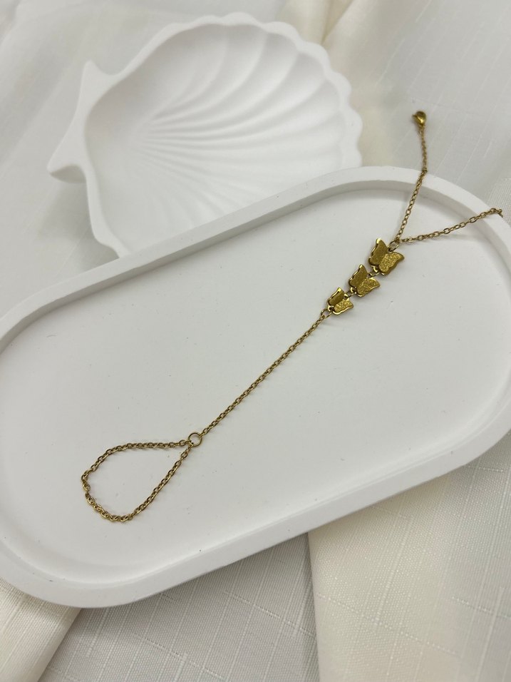 Altın renkli, zincir detaylı el zinciri, kelebek süslemeleriyle bohem ve minimalist tarzlara uygun, düğünlerde kullanılabilir.