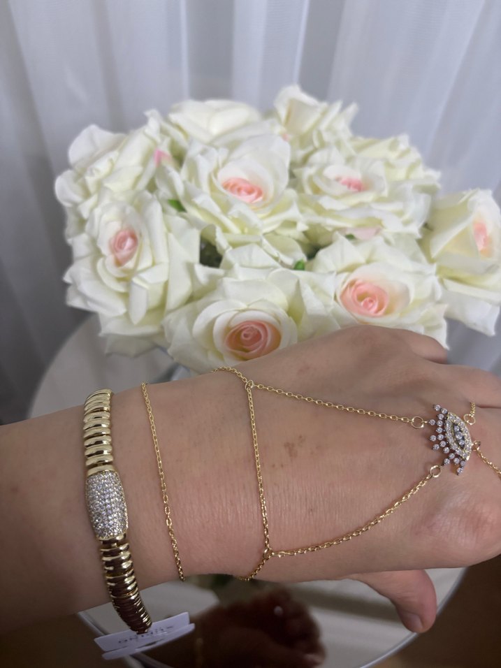 Altın renkli, zincir detaylı kadın el zinciri, çiçek desenli ve bohem tarzıyla düğünler için klasik bir şıklık sunar.