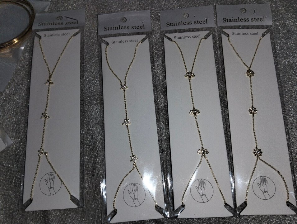 Paslanmaz çelikten yapılmış, zincir detaylı ve nakış desenli altın renk kadın el zinciri. Günlük kullanıma uygun, bohem tarzda. ✨