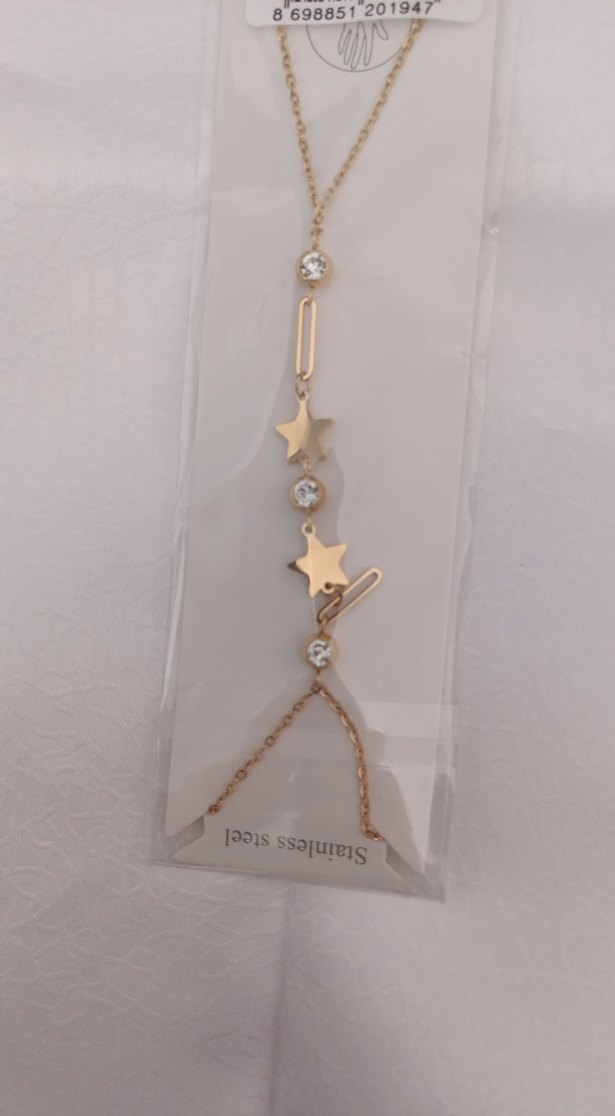 Altın renkli, zincir detaylı kadın el zinciri, yıldız figürleri ve küçük kristallerle minimalist ve çağdaş tarz sunar. ✨