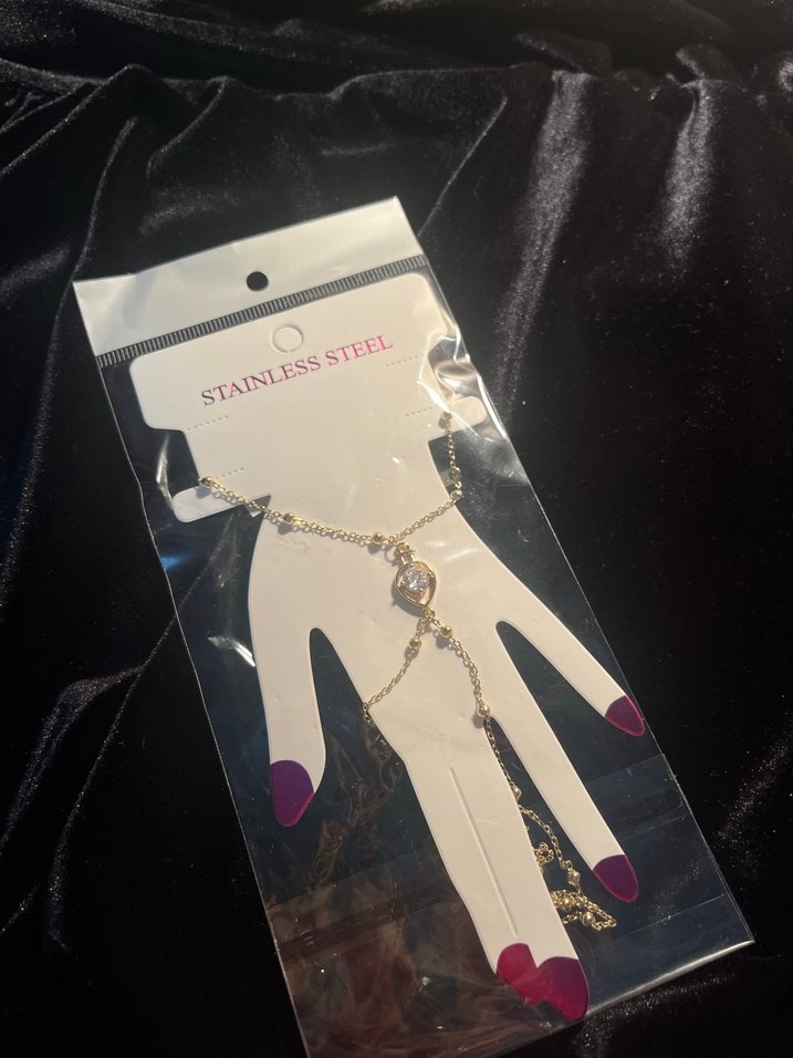 Paslanmaz çelikten yapılmış, zincir detaylı altın renk kadın el zinciri. Parlak yüzeyli, baskılı ve minimalist tarzda günlük sokak kullanımı için uygun. ✨