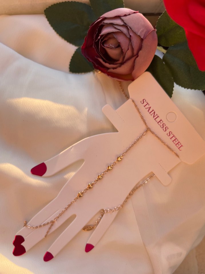 Paslanmaz çelikten yapılmış, zincir detaylı altın renk kadın el zinciri. Bohem tarzıyla düğün ve minimalist görünümlere uygun.