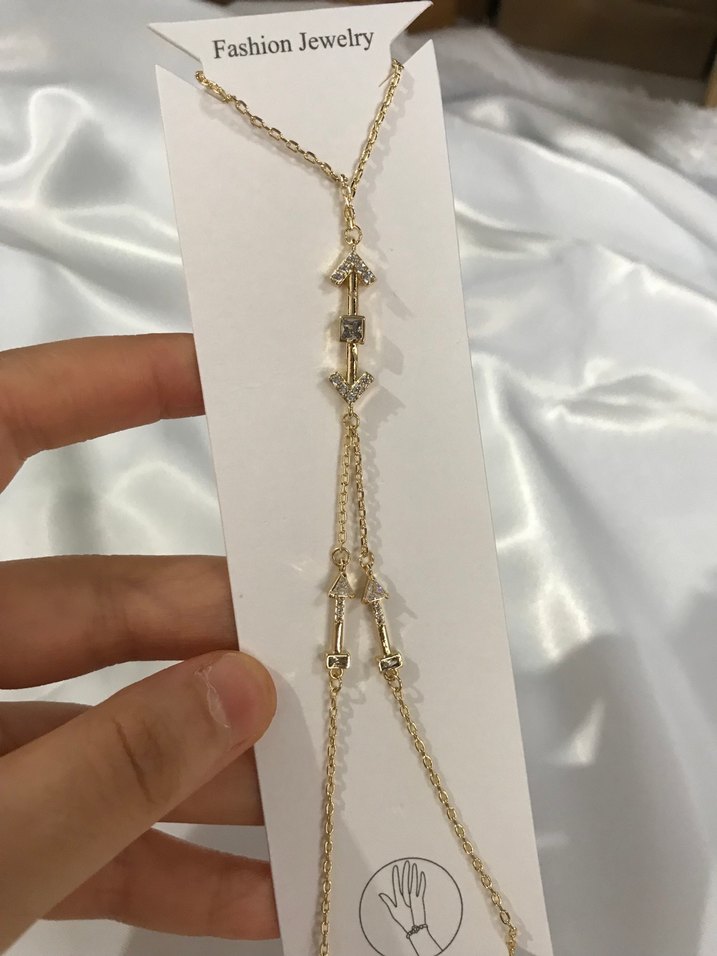 Altın renkli, zincir detaylı ve ok şeklinde süslemeleri olan minimal bohem tarzda kadın el zinciri. Günlük kullanım için uygundur. ✨