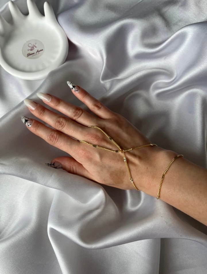 Altın renginde zincir detaylı kadın el zinciri, minimal ve bohem tarzda. Günlük kullanıma uygun, parlak görünümlü. ✨ her kombininize uyum sağlayabileceğiniz zarif ve ince✨ Almak için ilan açtırabilirsiniz ❤️