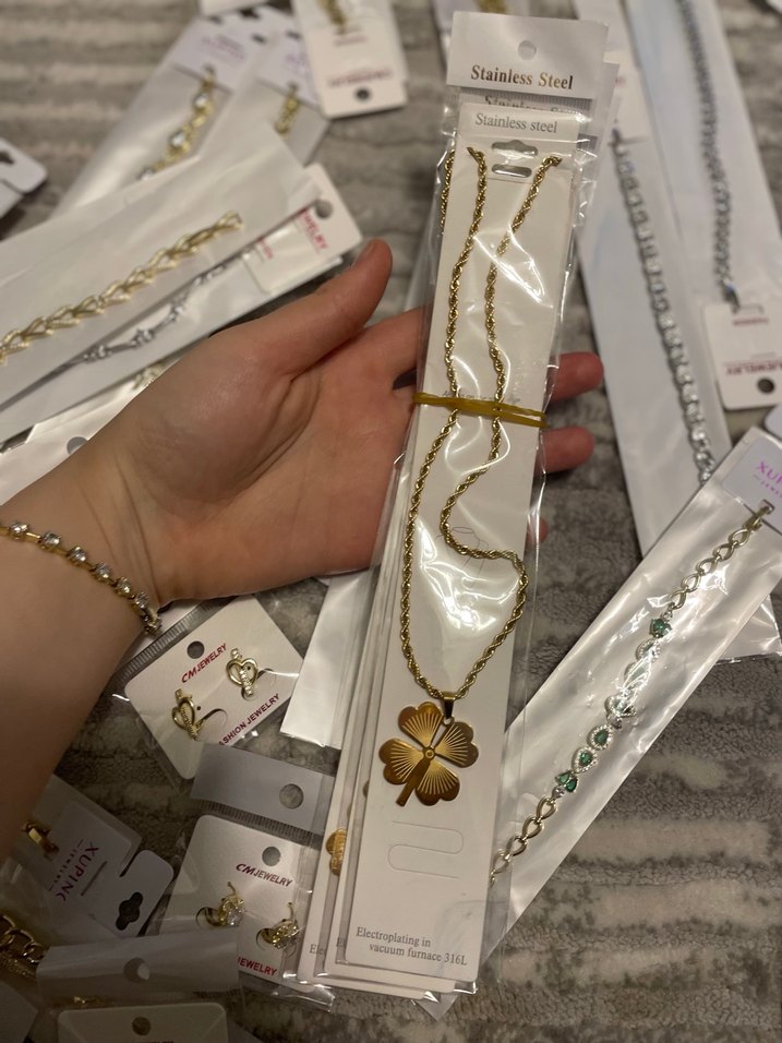 Altın renkli, zincir detaylı ve baskılı dört yapraklı yonca figürlü kadın kolye. Paslanmaz çelikten üretilmiş, günlük sokak stili için uygun, midi uzunlukta. SIFIR ÇELİK FIYATLARI DEGISIYO SORUN LĞTFEN öne cıksın dıye bu fıyat