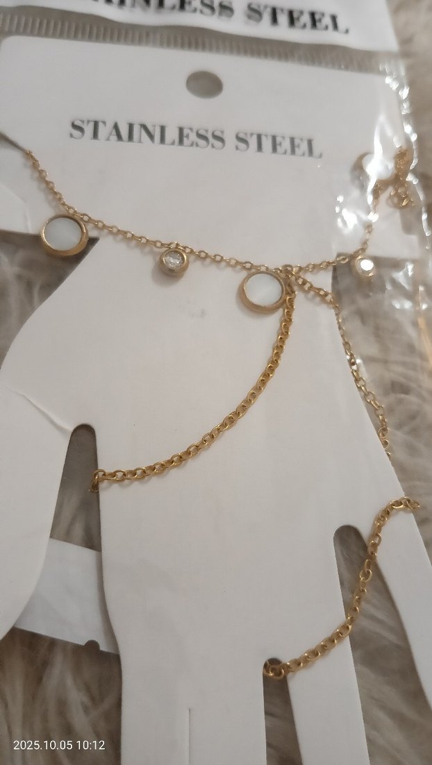 Altın renginde, zincir detaylı ve soyut dairesel süslemelere sahip paslanmaz çelik kadın el zinciri. Trendy ve günlük kullanıma uygun. ✨