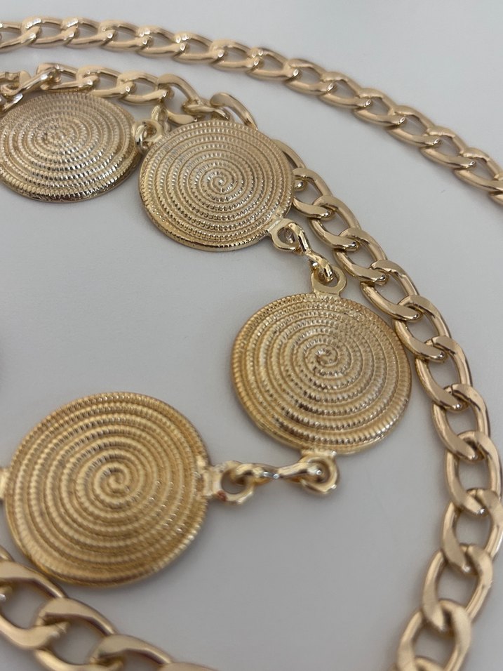 Altın renkli, zincir detaylı kadın vücut zinciri. Parlak yüzeyli ve bohem vintage tarzına uygun dairesel desenlere sahiptir.