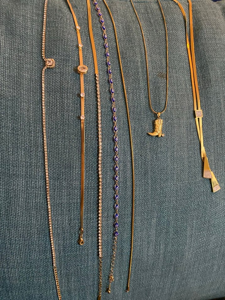 Altın renkli, zincir detaylı kadın vücut zincirleri, minimalist ve nakışlı desenlere sahip. Bohem ve retro tarzda, günlük kullanıma uygun. ✨ Tek tek de satın alabilirsiniz Nazar boncuklu kolye hariç hepsi Çelik Nazar boncuklu kolye koton marka Fiyat sorunuz