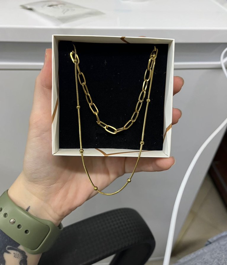 Altın renginde, zincir detaylı kısa uzunlukta, minimalist ve çağdaş tarza sahip parlak yüzeyli kadın kolye. Desensiz ve günlük kullanıma uygun. Çeliktir