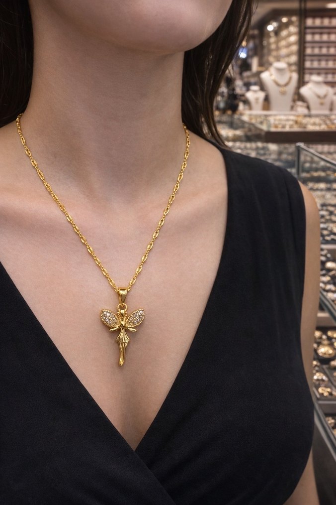 Altın Renk Zincir Detaylı Melek Kolye