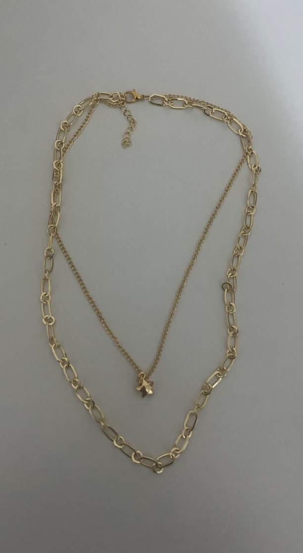 Altın renkli, zincir detaylı, minimal ve bohem tarzda kadın kolyesi. Küçük bir figürlü uçlu, parlak ve günlük kullanıma uygun.