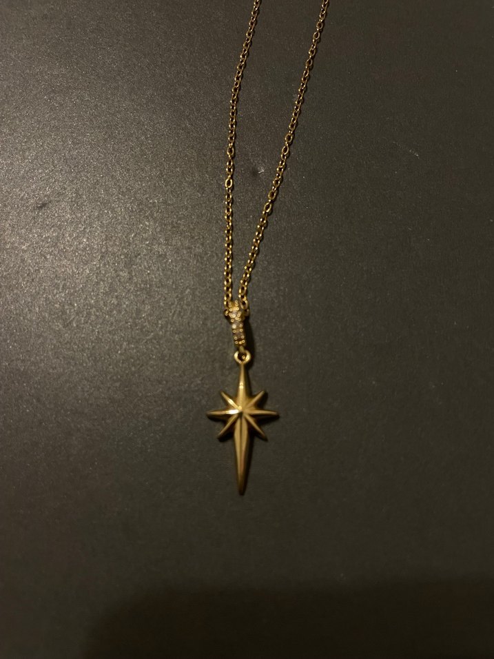 Altın renkli, zincir detaylı ve parlak yüzeye sahip minimal yıldız figürlü midi uzunlukta kolye. Günlük klasik şıklık için uygun. ✨
