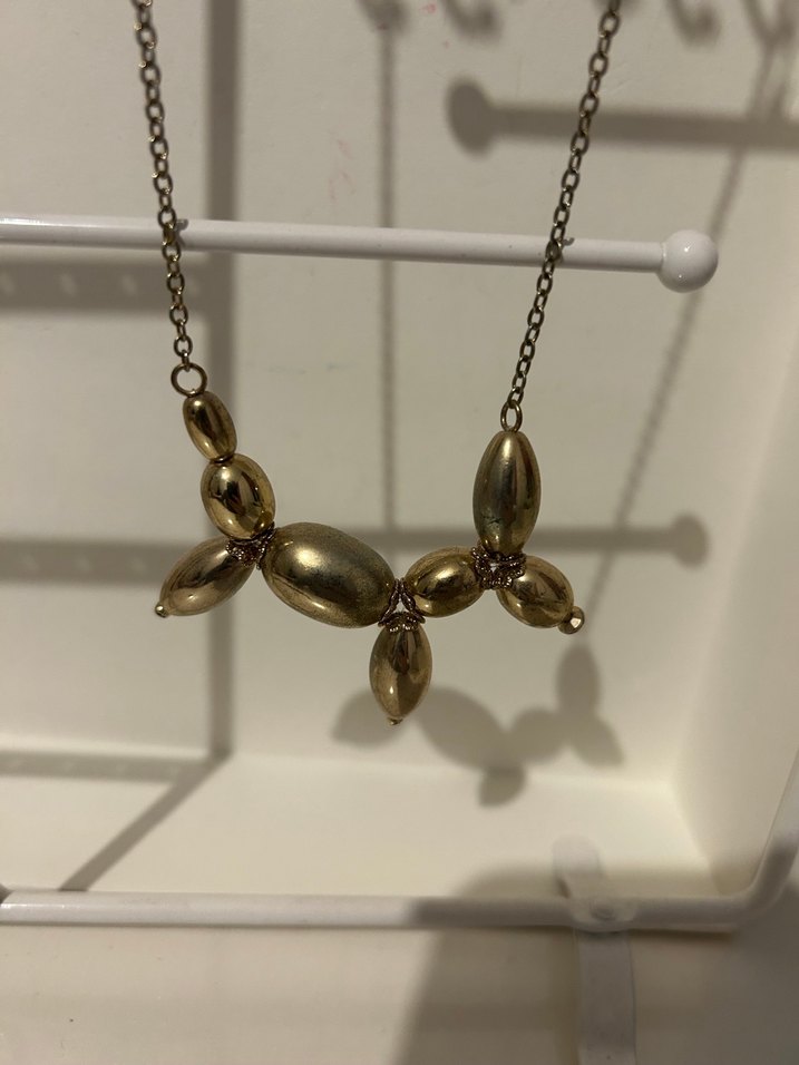 Parlak altın renkli zincir detaylı, oval boncuklu midi uzunlukta vintage ve bohem tarzda kolye, romantik akşamlar için uygun. Zincir detaylı, altın rengi kolye. Farklı tarzlara uyum sağlayabilir. Kullanılmış üründür