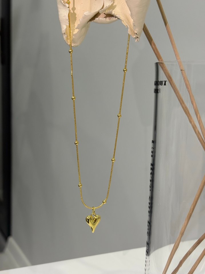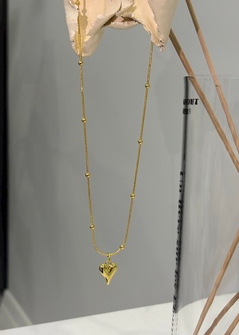 Parlak altın renkli, zincir detaylı ve midi uzunlukta, cesur kalp figürlü günlük kullanıma uygun kolye