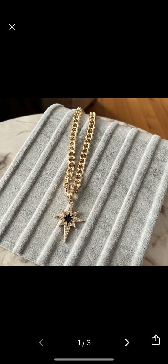 Altın renkli, zincir detaylı ve siyah merkezli yıldız şeklinde kolye ucu olan modern klasik tarzda midi uzunlukta kolye.