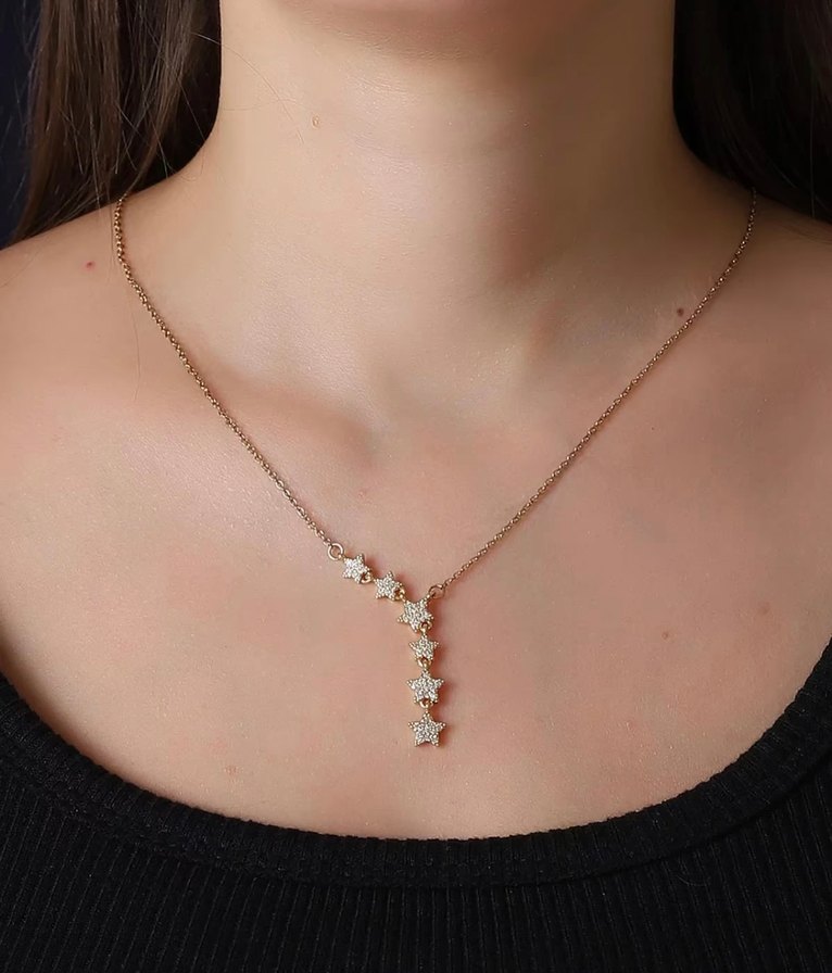 Altın renkli zincir detaylı bu kolye, nakış işlemeli yıldız figürleriyle minimalist ve bohem tarz sunar, günlük kullanıma uygundur.