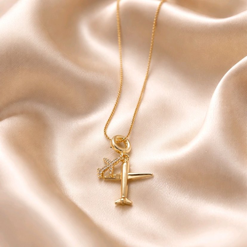 Kısa uzunlukta, zincir detaylı altın renkte mini uçak figürlü kadın kolyesi, romantik akşamlar için modern Paris tarzı aksesuar. ✈️