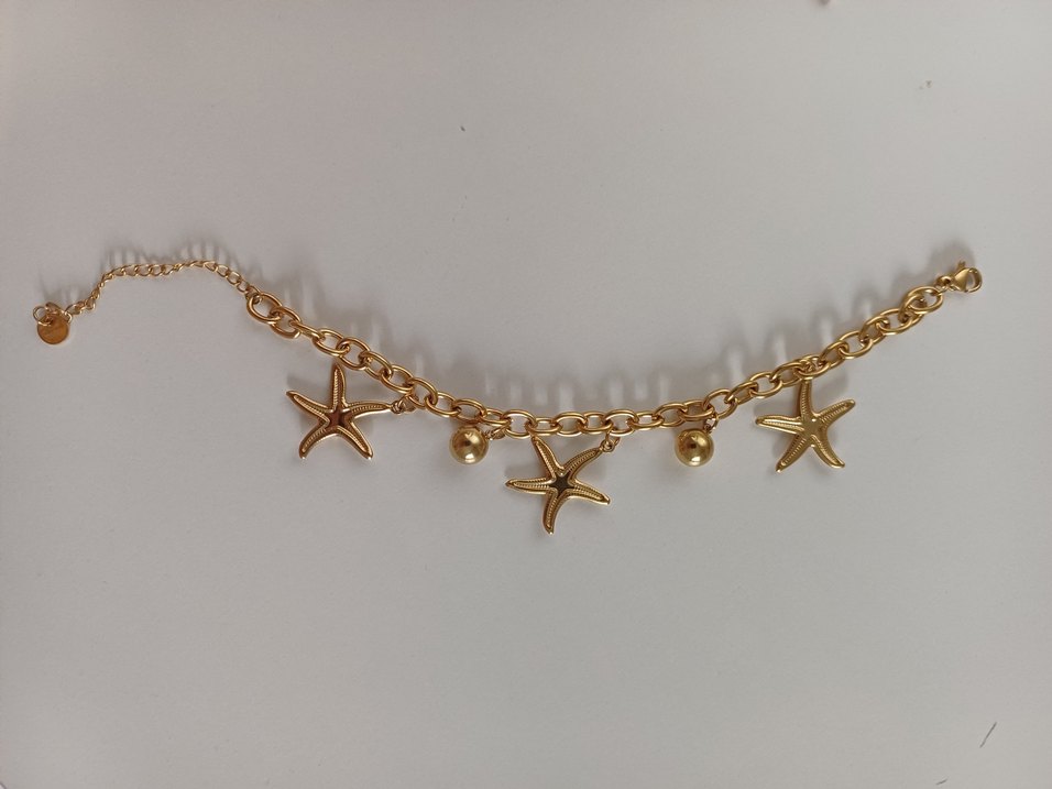 Parlak altın renkli zincir üzerinde denizyıldızı ve boncuk detaylı, bohem ve retro tarzda kısa uzunlukta kadın kolye.