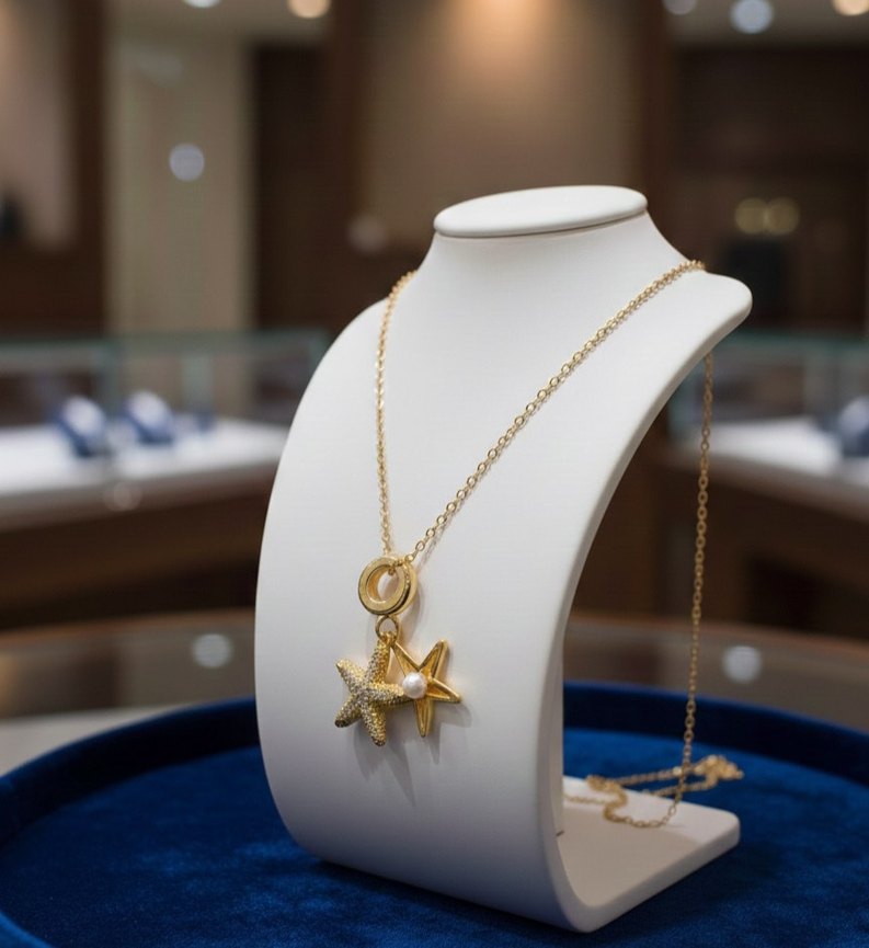 Parlak altın renkte, kısa zincirli ve yıldız figürlü, işleme detaylı mini kolye. Günlük kullanıma uygun şık tasarım. ✨