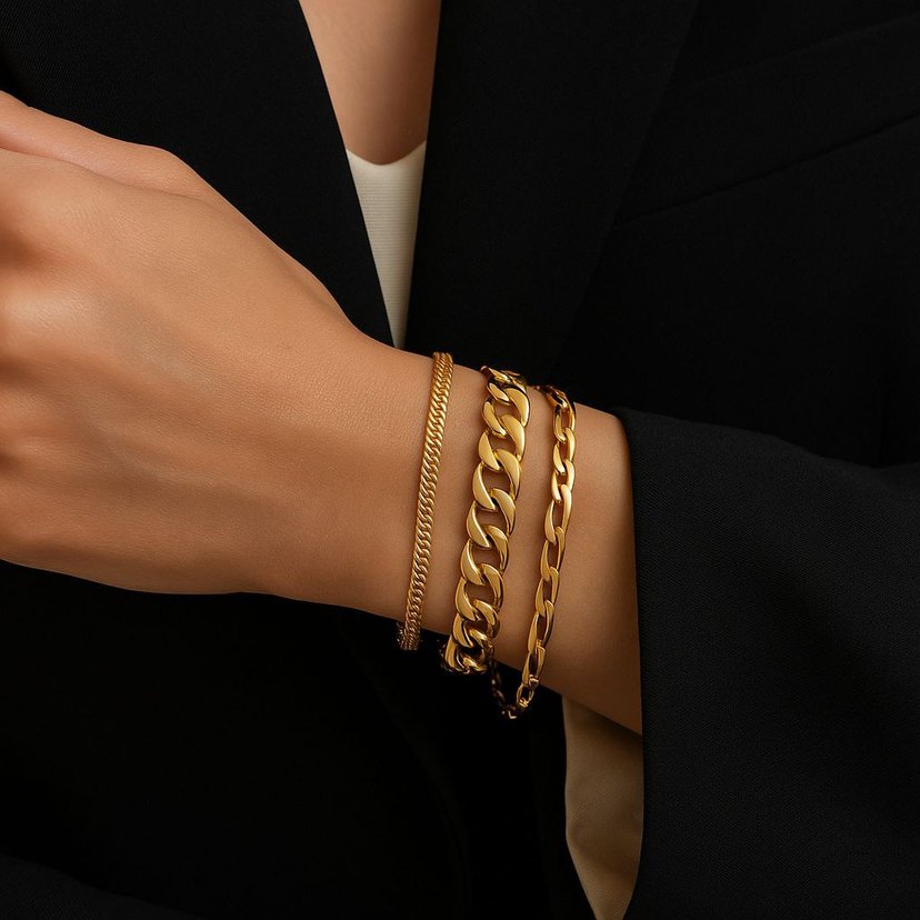 Parlak altın renkli, zincir detaylı, cesur ve minimalist tarzda günlük kullanıma uygun bileklikler.
