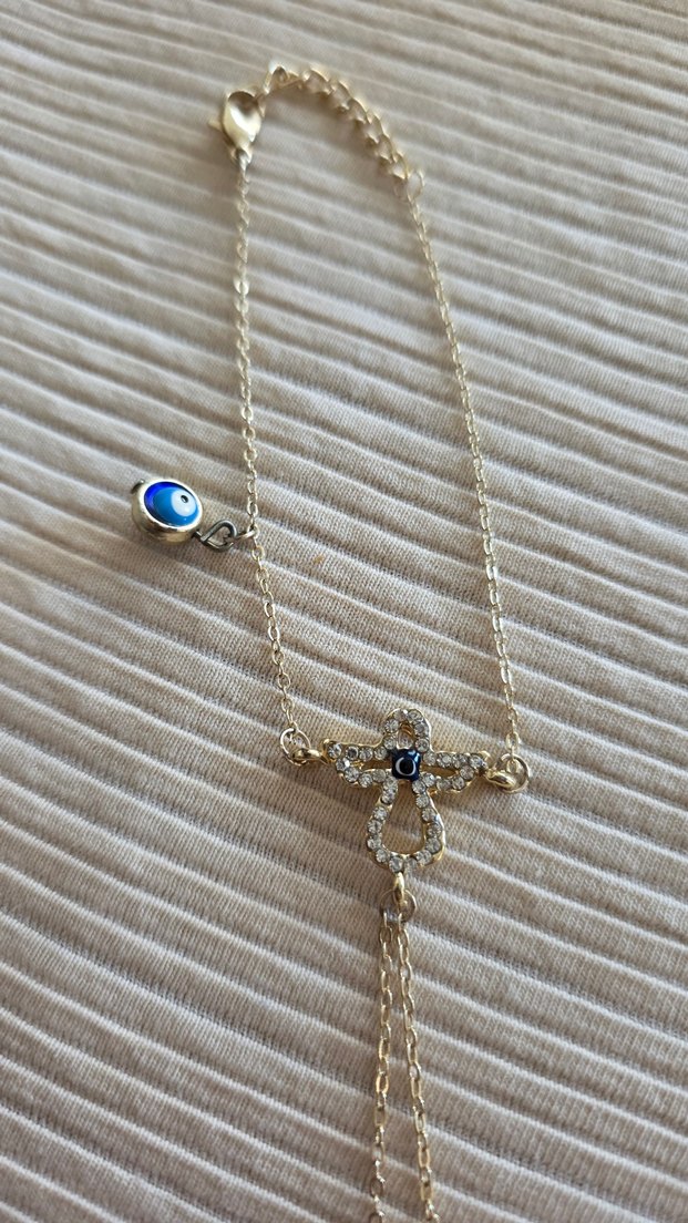 Altın renginde, zincir detaylı, nakış desenli ve küçük mavi nazar boncuğu bulunan minimalist ve bohem tarzda bileklik. ✨şahmeran bileklik