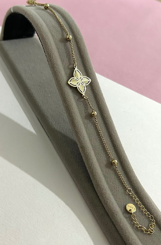 Altın renk zincir detaylı, nakış desenli çiçek motifiyle günlük kullanıma uygun minimalist ve çağdaş bileklik.