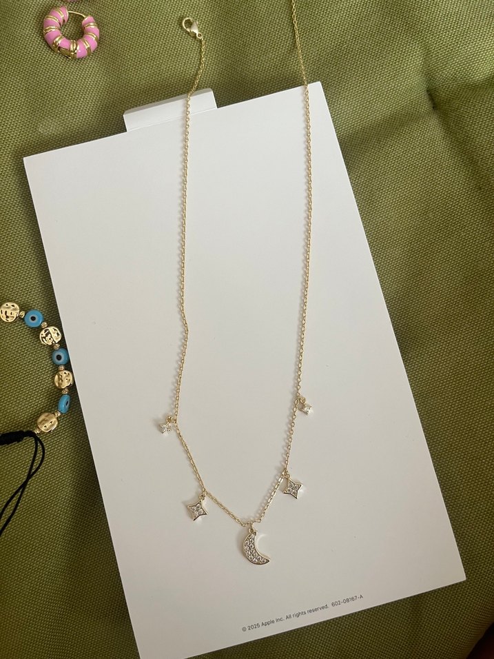 Altın renk zincir detaylı, ay ve yıldız figürlü minimal ve bohem tarzda günlük kullanıma uygun kolye.