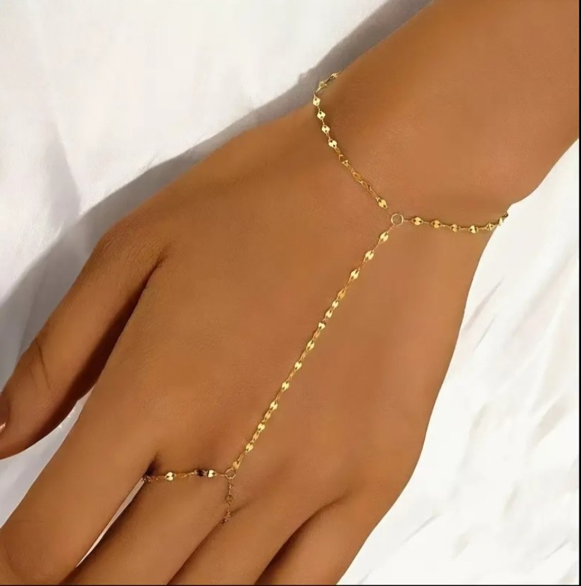 Paslanmaz Çelik Altın renkli, zincir detaylı kadın yüzüklü bileklik. Hem klasik hem de şık tarzda, parlak görünümüyle günlük kullanıma uygundur. ✨