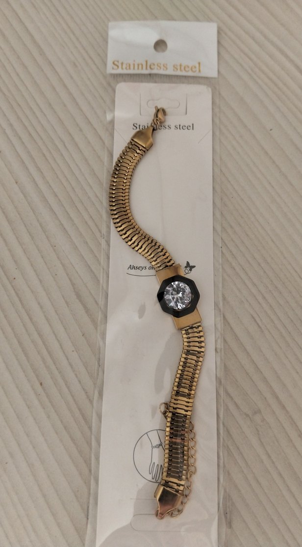 Paslanmaz çelikten yapılmış, zincir detaylı ve yılan desenli altın renk kadın bileklik. Koyu altıgen taşlı şık detay içerir.
