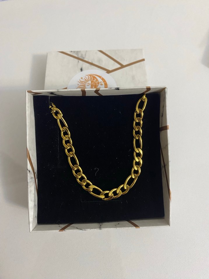 Parlak altın renkli, zincir detaylı kolye. Minimalist, desen içermeyen tasarımıyla günlük sokak stiline uygun.
