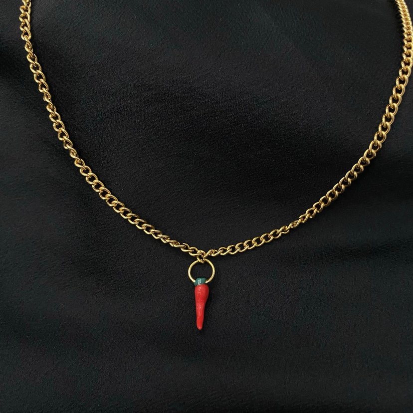 Altın renk zincirli, cesur kırmızı biber figürlü midi kolye, romantik gece için grunge punk tarzında.