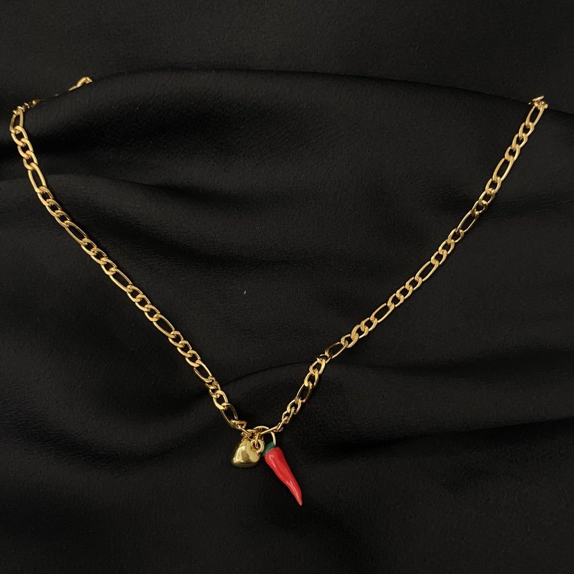 Altın renk kısa zincirli kolye, yılan ve küçük kırmızı biber figürlü, romantik geceler için cesur gotik tarzda.