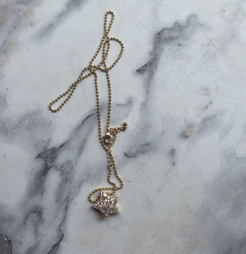 Altın renkli, zincir detaylı ve parlak yıldız figürlü normal midi uzunlukta kolye. Minimalist ve sokak stiline uygun, günlük kullanıma ideal.