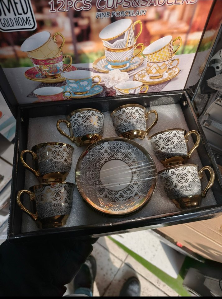 İnce porselenden yapılmış, altın desenli 12 parçalık kahve fincanı ve tabağı seti. Zarif altın saplı fincanlarla kahve sunumu için idealdir. ☕