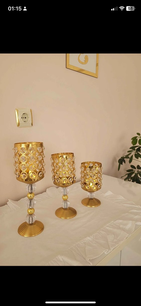 Altın renkli, desenli ve şeffaf detaylı 3 farklı boyda mumluk seti, mekana şıklık katar. ️