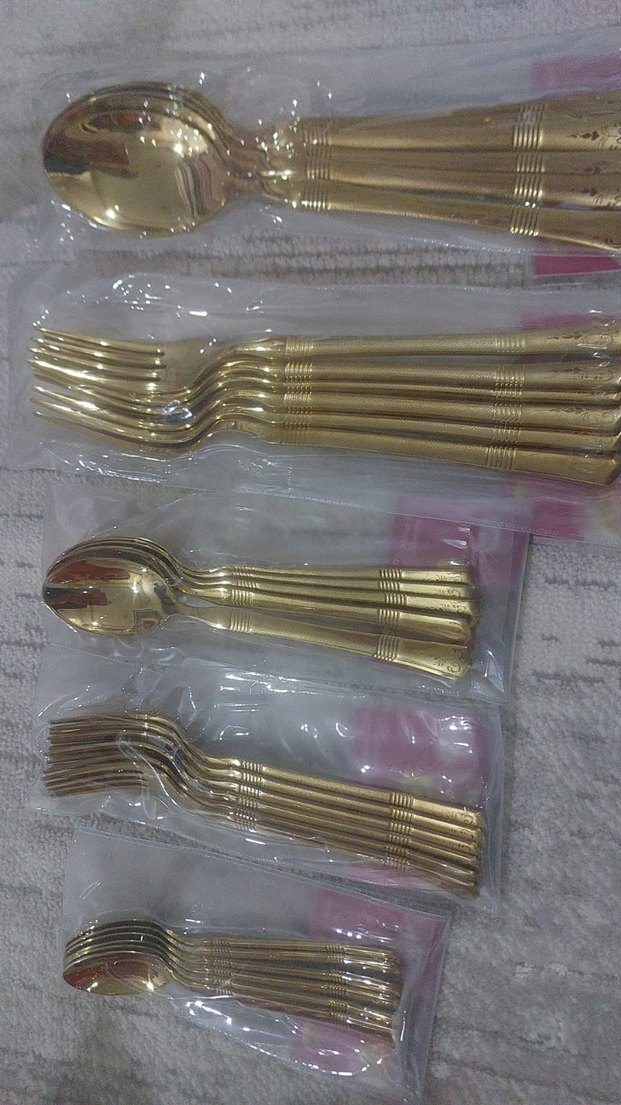 Altın renginde 36 parçadan oluşan çatal ve kaşık seti, şık ve pürüzsüz yüzeye sahiptir. Sofranızı zenginleştirmek için uygundur.