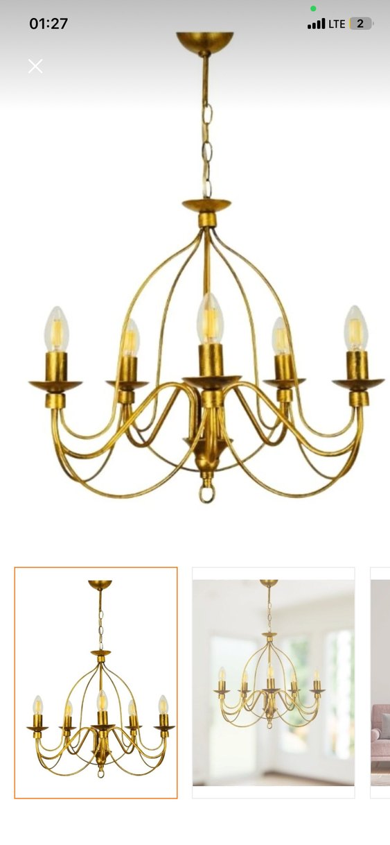 Altın renginde beş kollu avize, kıvrımlı kollar ve ayarlanabilir zincir askı ile şık bir aydınlatma sunar.