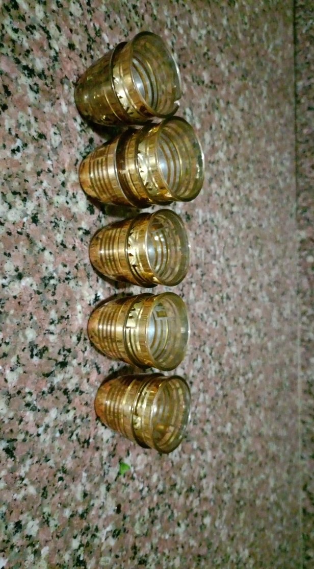 İnce desenli, açık altın renkli 5'li dekoratif bardak seti, içecek servisi için uygundur. ✨11tane var bir tanesi kenardan hafif bir deforme var