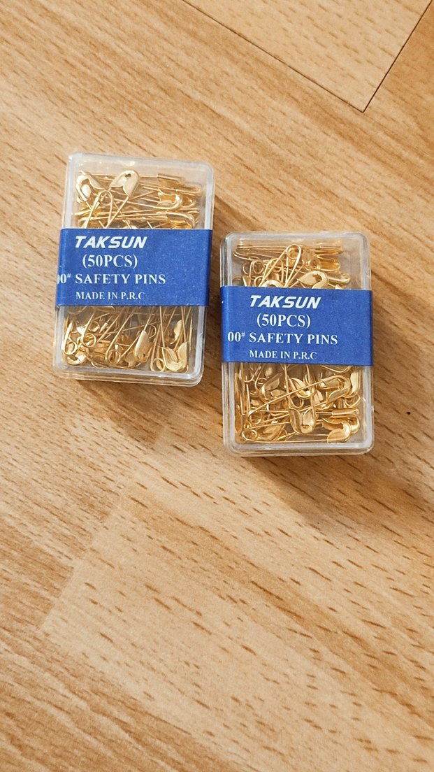 50 adet altın renkli emniyet iğnesi, kompakt plastik kutuda. P.R.C üretimi, çeşitli kullanımlar için uygundur.