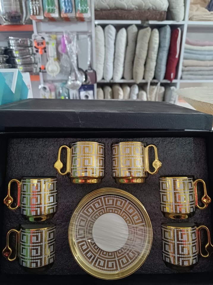 Altın renkli, geometrik desenli 6 kahve fincanı ve uyumlu tabaklardan oluşan set. ☕