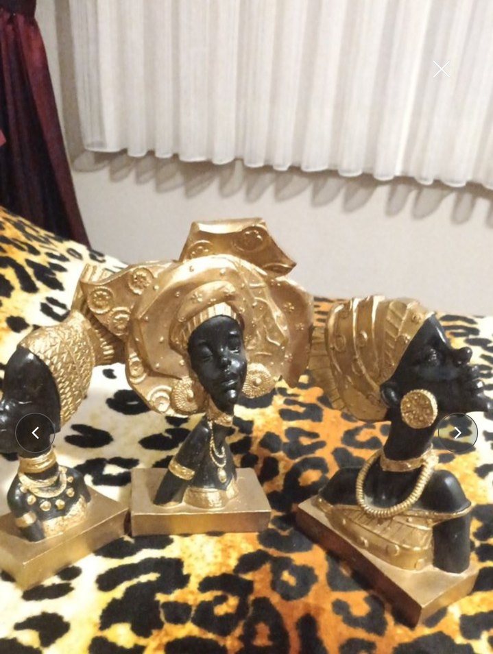 Altın detaylı koyu renkli Afrika figürleri seti, geleneksel başlık ve takılarla süslenmiştir. Dekoratif kullanım için uygundur.