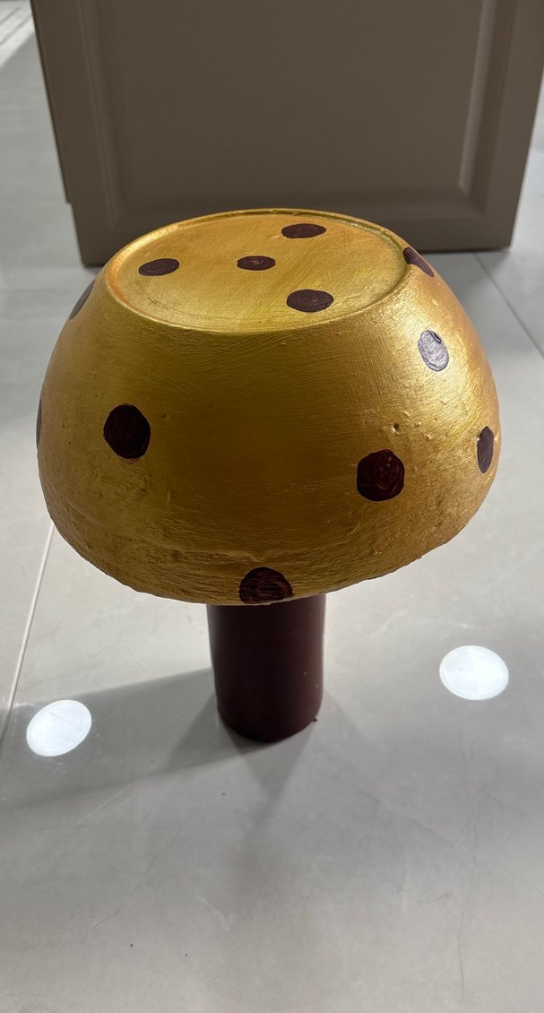 Koyu altın renginde, kahverengi benekli, mantar şeklinde alçı süs. Düzgün yüzeyli