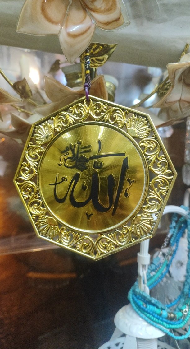 Parlak altın renkli, Arapça 'Allah' yazılı vintage tarzda süslü erkek rozeti. ✨