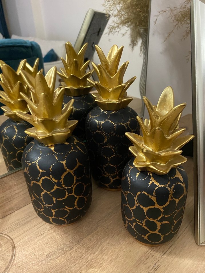 Koyu taban üzerine canlı altın renkli ananas figürlü dekoratif objeler, mekâna şık bir dokunuş katıyor.