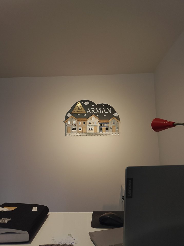 OZEL SİPARİS USULÜ ANAHTARLİK Altın renkli, "ARMAN" yazılı ve ev desenli duvar lambası, ortamınıza yumuşak ve sıcak ışık sağlar.